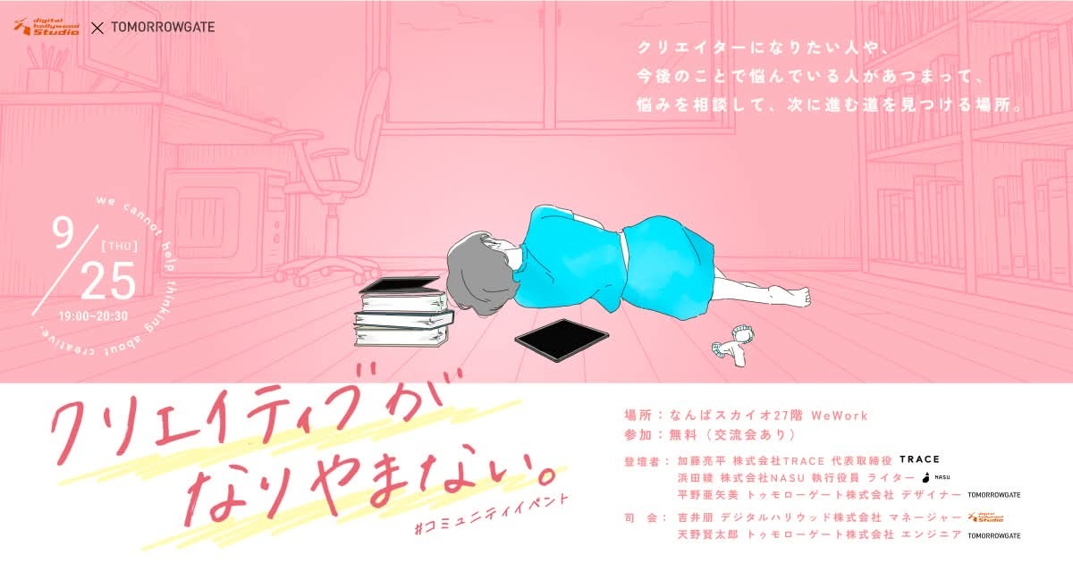 IT関連およびデジタルコンテンツの人材育成スクール デジタルハリウッド(運営会社:デジタルハリウッド株式会社、本社/本校:東京都千代田区、代表取締役社長兼CEO:春名啓紀、学長:杉山知之)が運営をする、新しい学びのスタイルを通して多様なライフスタイルを支援し全国へ展開している、Webと動画について学べるラーニングスタジオ『デジタルハリウッドSTUDIO』のSTUDIOなんばでは、キャリアやクリエイティブに悩みや相談事を抱える、主に業界経験が浅い方や駆け出しの方に向けたイベント、「クリエイティブがなりやまない。はじめの一歩を探すためのイベント」を、9月25日(木)にトゥモローゲート株式会社と共同開催します。