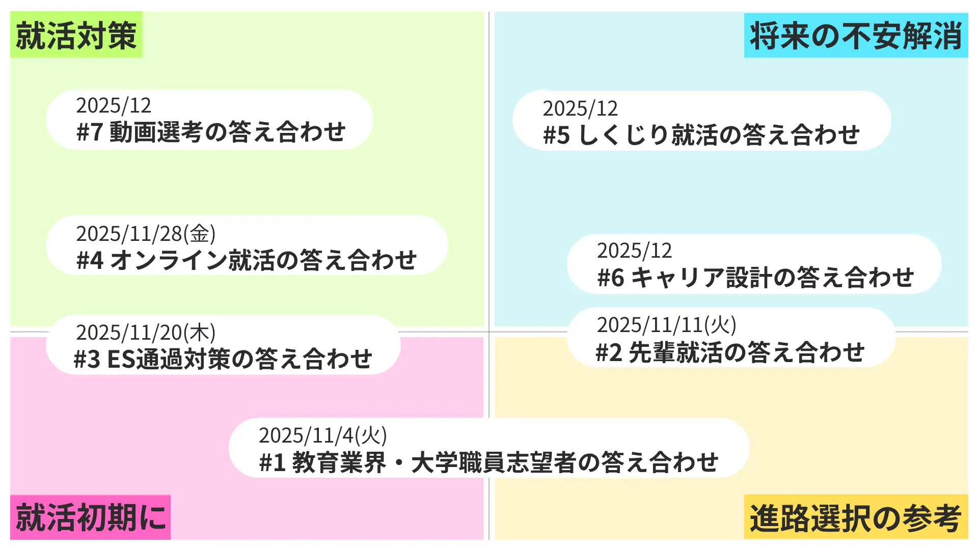 参加を検討する学生の悩みやフェーズによってピッタリのテーマをお届けします。Tipsをお伝えするものから社会人の経験談を聞けるものまでご用意いたしますので、お好きな回をご予約ください。