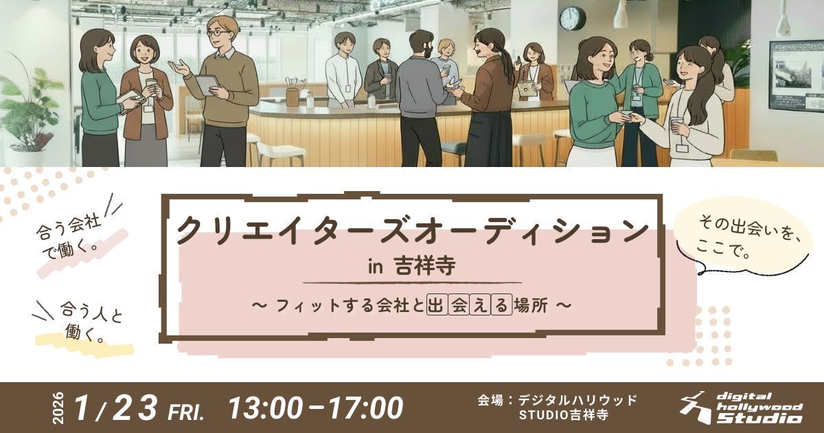 IT関連及びデジタルコンテンツの人材育成スクール、デジタルハリウッド(運営会社:デジタルハリウッド株式会社、本社/本校:東京都千代田区、代表取締役社長兼CEO:春名啓紀、学長:杉山知之)が運営をする、新しい学びのスタイルを通して多様なライフスタイルを支援し全国へ展開している、Webと動画について学べるラーニングスタジオ『デジタルハリウッドSTUDIO』のSTUDIO吉祥寺では、企業とクリエイターを繋ぐイベント『クリエイターズオーディションin吉祥寺~フィットする会社と出会える場所~』を2026年1月23日(金)に開催いたします。